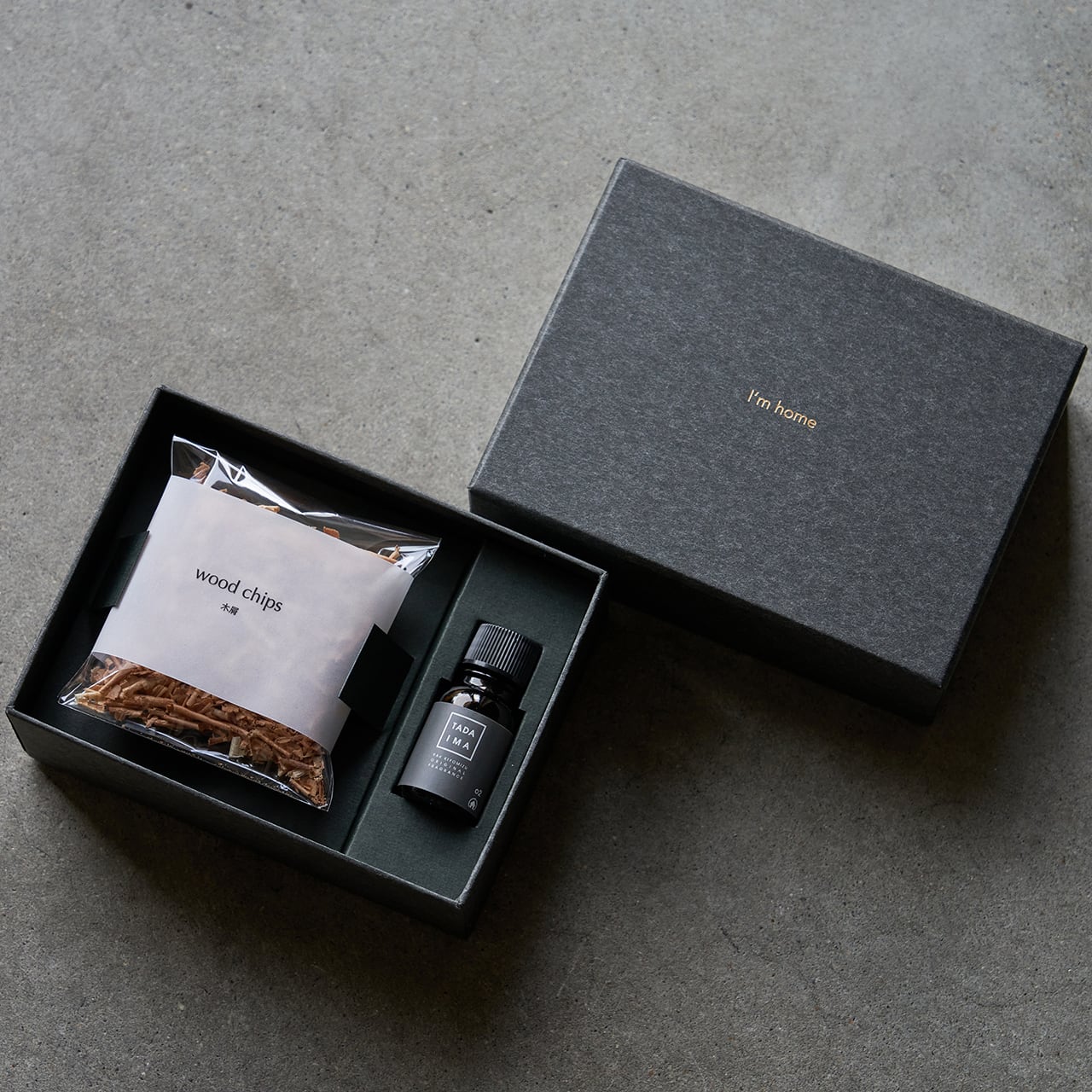 器(UTUSWA)を使用して香りを楽しめるアロマセットです。持続可能な木屑が付属、お好みのアロマオイルを1種ご選択下さい。
